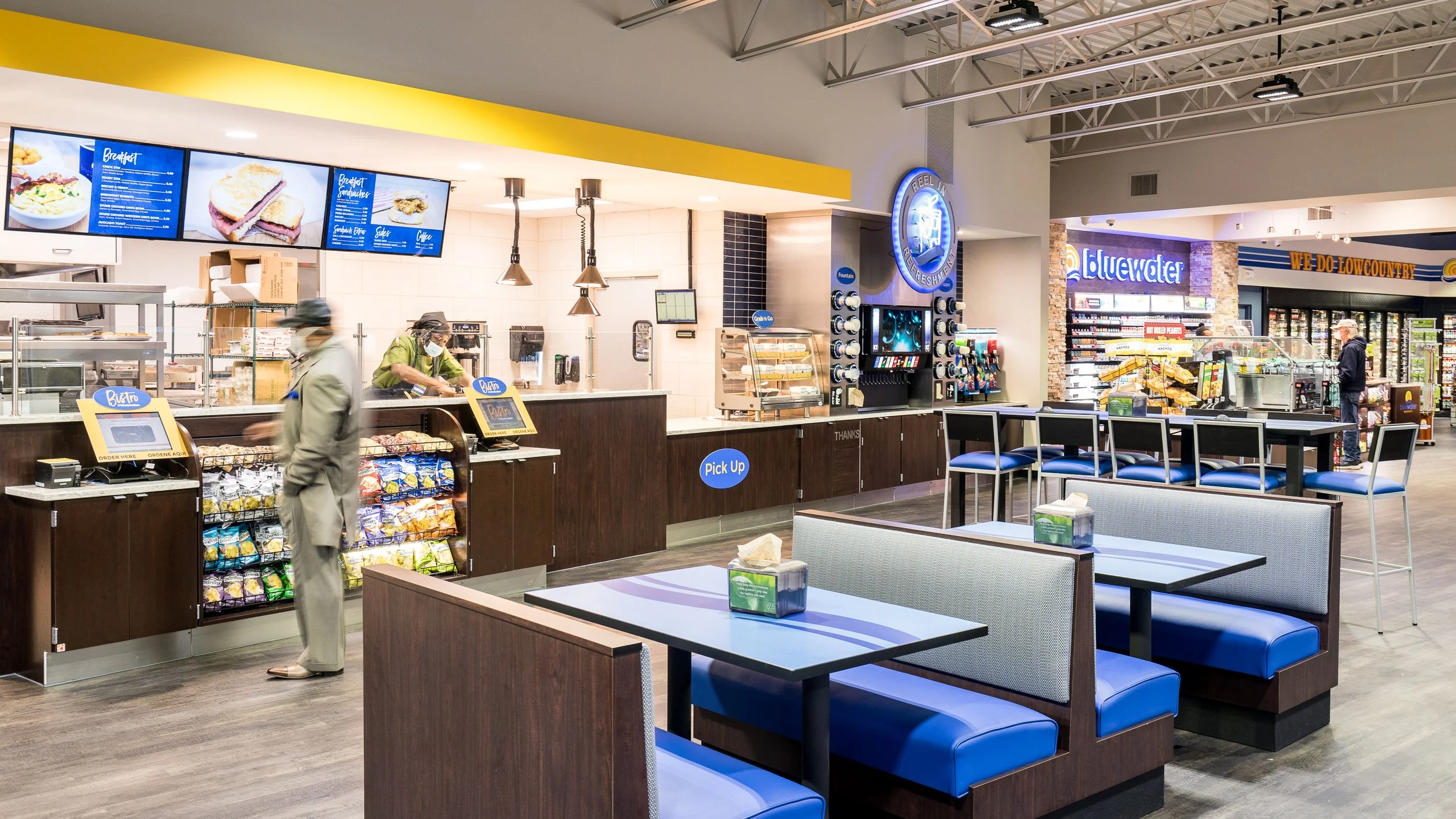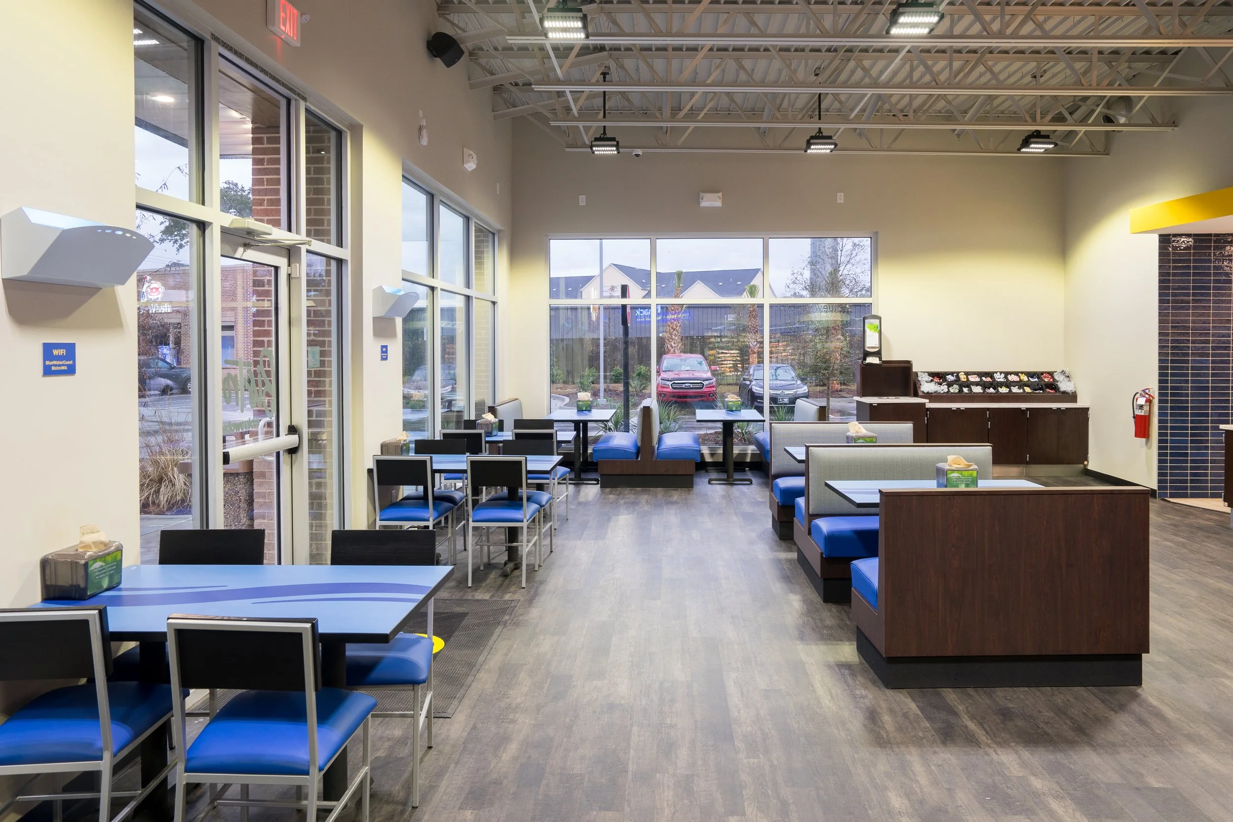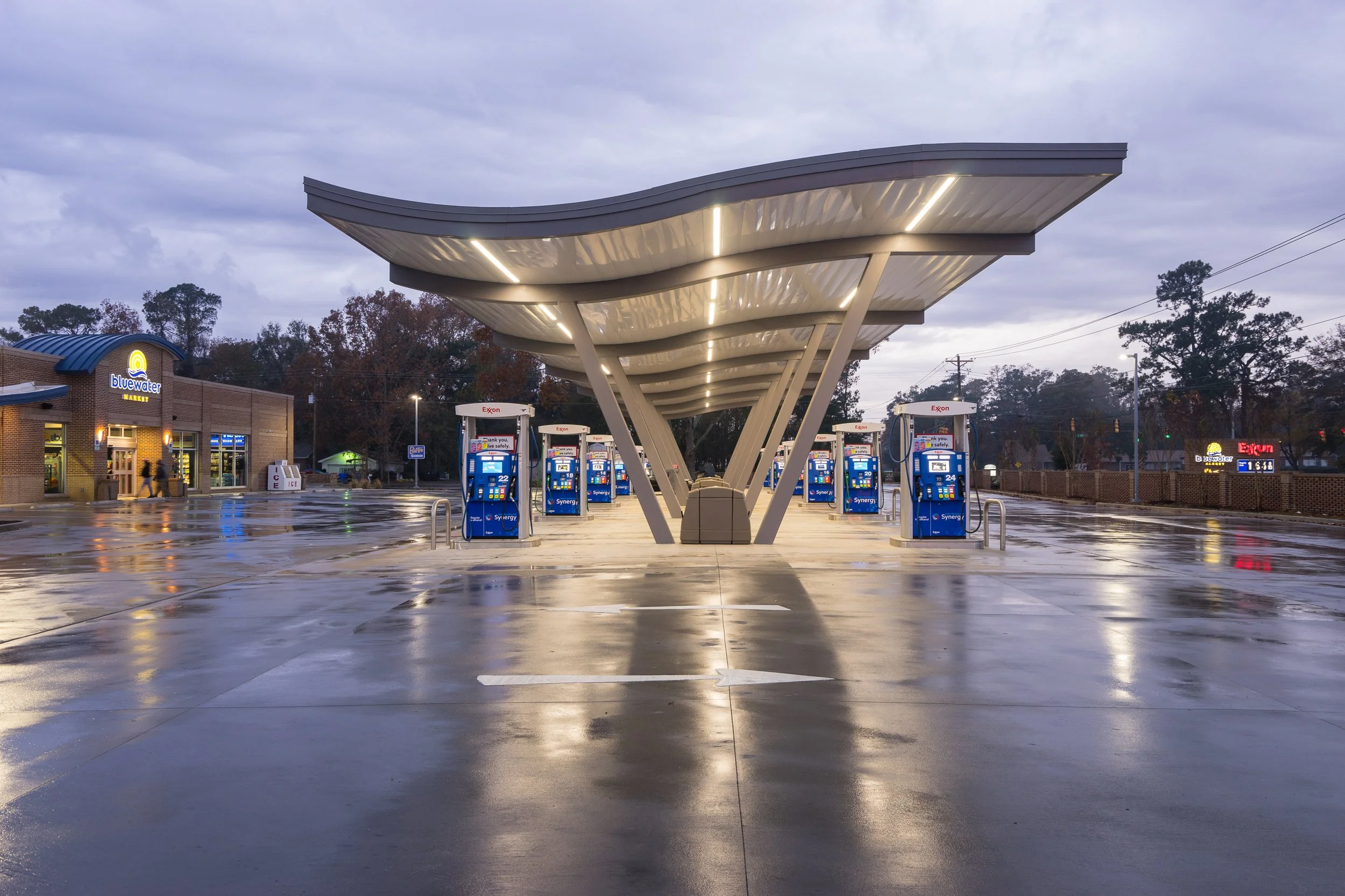• This project features a new convenience store, sculptural gas canopy, and car wash facility, designed to create a bold visual identity along Highway 17. The iconic wave-form canopy serves as the focal point, reinforcing brand recognition and making a striking architectural statement. Complementing this design, the curved roof and building canopy of the convenience store establish a cohesive and dynamic aesthetic. Inside, the store offers a restaurant, beer cave, coffee bar, and convenient grab-and-go options, providing a seamless and efficient experience for customers. Thoughtfully designed for both function and style, this project transforms a traditional roadside stop into an engaging and memorable destination.